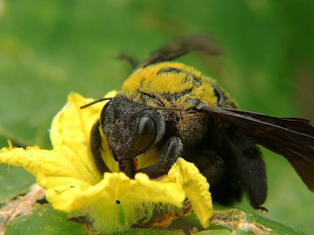 竹蜂體型鈍圓肥大,長(zhǎng)25~29毫米,體黑色,密生柔軟的黑絨毛,復(fù)眼一對(duì)。觸角稍彎曲,胸部背面密生黃毛。翅紫藍(lán)色,基部色澤較深,翅端較淡,全翅閃現(xiàn)金色光輝。足三對(duì),黑色而短。