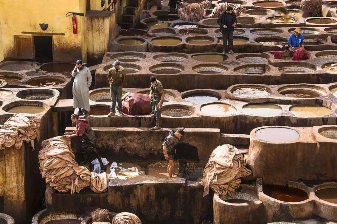 也記得菲斯古城內(nèi)的皮革染坊,這味道真的讓人終生難忘,怪不得上樓之前有人給我們發(fā)放薄荷葉呢,可惜即使鼻孔塞滿了薄荷葉也堵不住那味。